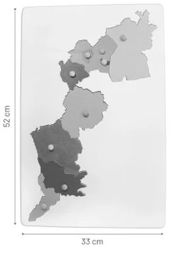 Die handgefertigten Puzzleteile können einzeln herausgenommen, abgetastet und nachgezeichnet werden. So entwickeln Kinder ein Gefühl für die Lage, Form und Größe der Bezirke. Die kleinen Holzgriffe markieren dabei die Positionen der Hauptstädte und erleichtern das Greifen der Teile.