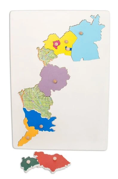 Mit diesem Burgenland Holzpuzzle lernen Kinder die Bezirke und Hauptstädte auf spielerische Weise kennen. Jedes Puzzleteil entspricht einem politischen Bezirk und ist in leuchtenden Farben bemalt. Unter den Puzzleteilen befindet sich eine detaillierte Landkarte, die gleichzeitig das Kartenlesen und geografische Verständnis fördert.