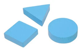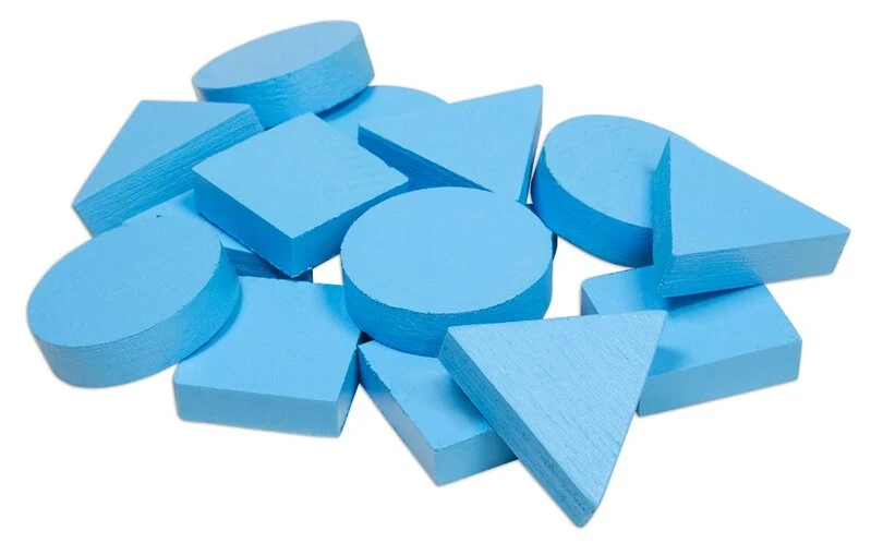 Dieses Set enthält 15 Holzchips in den geometrischen Formen Dreieck, Quadrat und Kreis. Die Formen sind sorgfältig geschliffen und in einem schönen hellblauen Farbton lackiert.