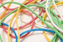 Bunte Gummiringe in verschiedenen Größen und Farben sind in ausreichender Menge im Set enthalten. Ebenfalls enthalten ist ein bruchsicherer Geometriespiegel, der zur Überprüfung der Spiegelungen eingesetzt werden kann.