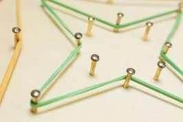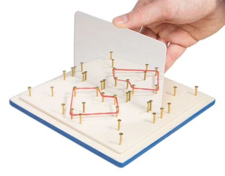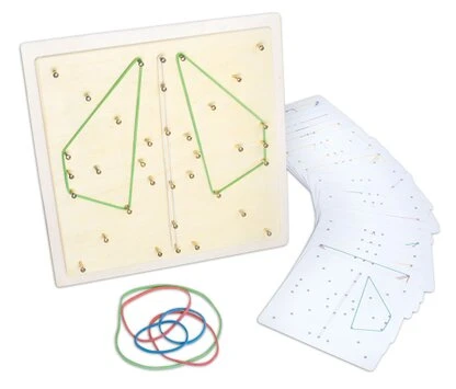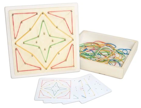 Formen und Muster kennen. Gummiringe werden um die Nägel des Geometriebretts