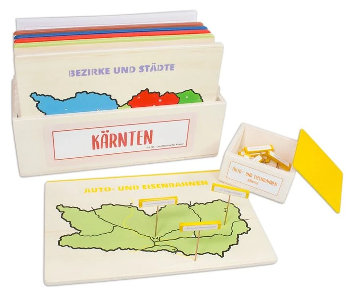 Mit diesen Kärnten Steckkarten können Kinder das Bundesland auf spielerische Weise kennenlernen. Sie entdecken die wichtigsten Städte, Flüsse, Gebirge und Landschaftsgebiete und erhalten dabei ein anschauliches Verständnis für die Geografie des österreichischen Bundeslandes Kärnten.