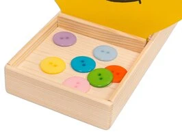 Der Bär wird liebevoll von Hand bemalt. Die farbenfrohen Knöpfe sind dank ihrer glatten Oberfläche und handlichen Größe angenehm zu greifen.
