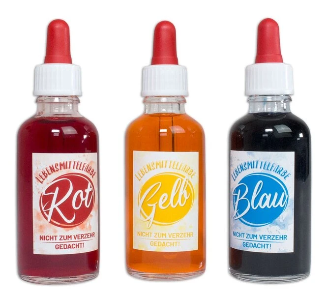 Im Set enthalten sind die Farben Gelb, Rot und Blau, jeweils in einer 50-ml-Pipettenflasche. Die Lebensmittelfarben sind vielseitig einsetzbar, jedoch nicht zum Verzehr gedacht. Sie eignen sich ideal für «Übungen des täglichen Lebens» – beispielsweise um Wasser für Schüttübungen bunt einzufärben.