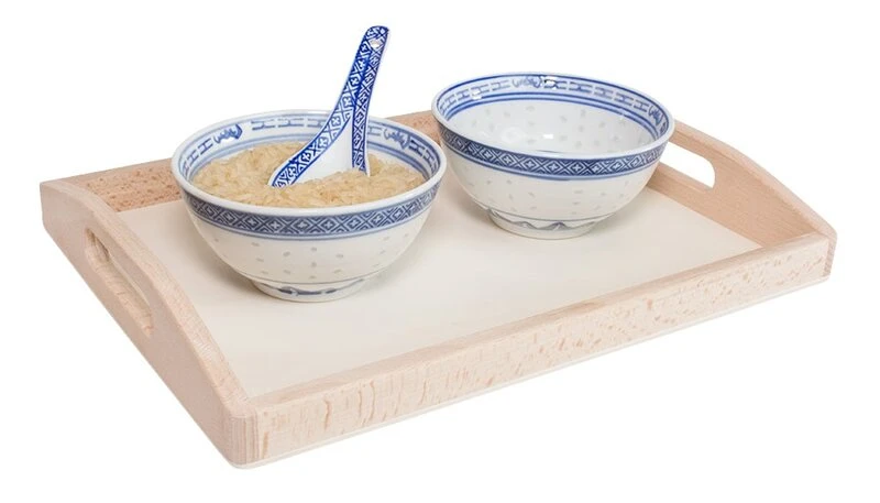 Zum Lieferumfang dieser Montessori-Übung gehört ein handgefertigtes Holztablett. Das Tablett hilft nicht nur dabei, die Übungsgegenstände ansprechend zu präsentieren, sondern schafft zugleich einen klar definierten Arbeitsbereich.