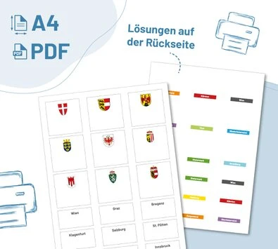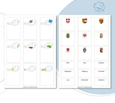 Diese Kärtchen sind zur Arbeit mit der Setzleiste gedacht und fördern spielerisch das Wissen über Österreichs Bundesländer, Hauptstädte und Wappen. Ziel ist es, jedem Bundesland die passende Hauptstadt und das entsprechende Wappen zuzuordnen.