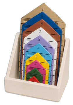 Haus. Mithilfe der farbigen Montessori-Perlenstäbchen wird die Summe des
