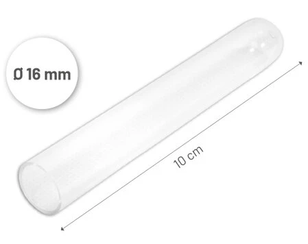 Die Reagenzgläser aus Kunststoff haben einen glatten Rand und ein Fassungsvermögen von 12 ml. Der Innendurchmesser beträgt etwa 13 mm, der Außendurchmesser 16 mm.