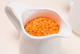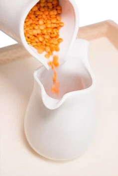 Die handlichen Porzellankannen lassen keinen Blick auf den Inhalt zu, weshalb beim Schütten sehr behutsam vorgegangen werden muss. Als Schüttmaterial dienen Linsen, die in ihrem leuchtenden Rot einen schönen Kontrast zu dem weißen Porzellan bilden.