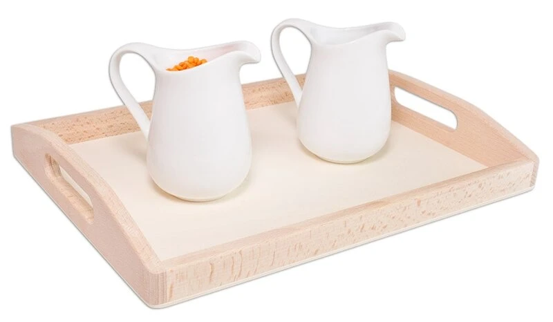 Zum Lieferumfang dieser Montessori-Übung gehört ein handgefertigtes Holztablett. Das Tablett hilft nicht nur dabei, die Übungsgegenstände ansprechend zu präsentieren, sondern schafft zugleich einen klar definierten Arbeitsbereich. Linsen sind in passender Menge im Set enthalten.