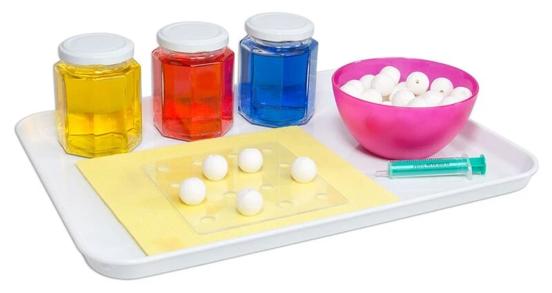 Um die Übung ansprechender zu gestalten, wird das Wasser mit Lebensmittelfarbe eingefärbt. Dadurch sind auch kleine verschüttete Mengen gut sichtbar. Die Lebensmittelfarbe lässt sich dank der praktischen Pipettenflasche einfach dosieren. Ebenfalls im Set enthalten ist ein Schwammtuch.