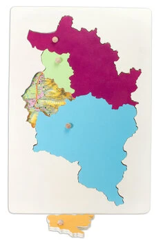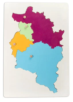 Die handgefertigten Puzzleteile können einzeln herausgenommen, abgetastet und nachgezeichnet werden. So entwickeln Kinder ein Gefühl für die Lage, Form und Größe der Bezirke. Die kleinen Holzgriffe markieren dabei die Positionen der Hauptstädte und erleichtern das Greifen der Teile.